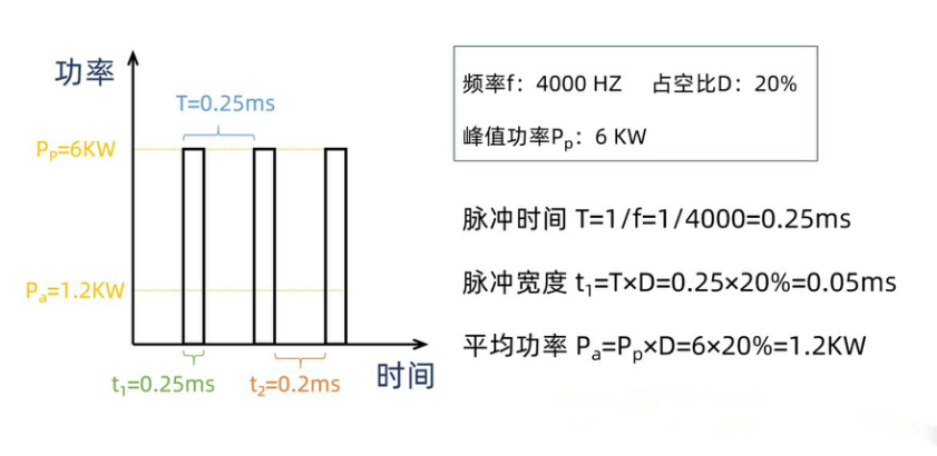 通常,我們在激光工藝調(diào)試中,對激光進(jìn)行調(diào)制時(shí),會設(shè)定峰值功率、脈沖頻率與占空比。接下來,我們用一個(gè)實(shí)例來說明如何計(jì)算PWM的各項(xiàng)參數(shù)。