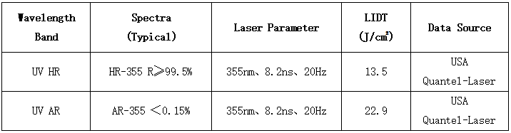 表1 355nm損傷測(cè)試數(shù)據(jù)(Tested By USA Quantel-Laser)